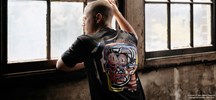 Attaquer’s bold designs captured the artist’s gritty, moody artworks perfectly – shooting their look book in an abandoned warehouse in Sydney.